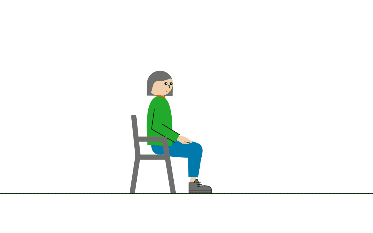 Asseyez-vous sur le bord avant d’une chaise et écartez les pieds sur le sol à la largeur de vos hanches, légèrement en retrait des genoux. Penchez-vous en avant vers vos genoux et levez-vous complètement sans vous aider des mains, puis rasseyez-vous. Vous avez effectué une répétition. Servez-vous d’une montre, de votre téléphone portable ou de notre guide audio pour vous chronométrer.